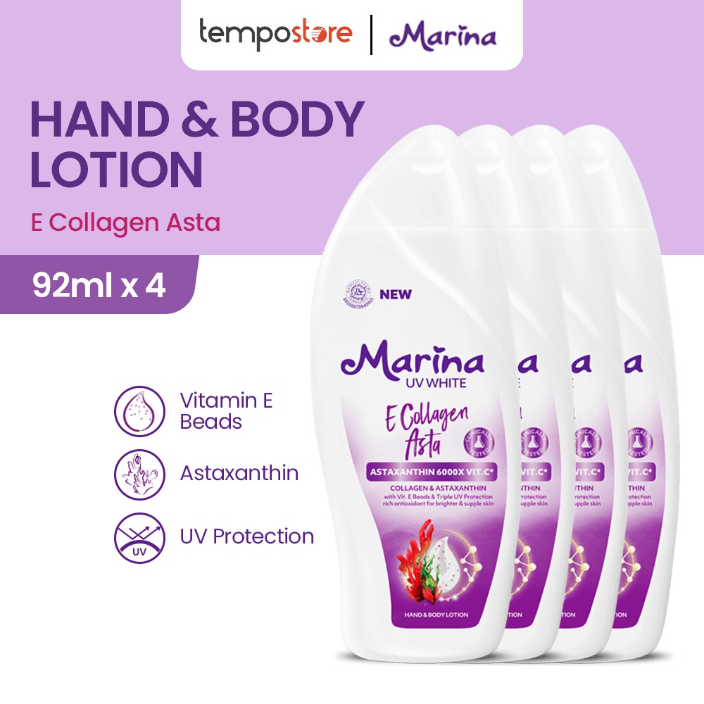 - 2. Perlindungan UV: Diperkaya dengan SPF, Marina UV White e-Collagen Hand Body Lotion melindungi kulit dari bahaya sinar UV yang dapat menyebabkan penuaan dini dan kerusakan kulit.